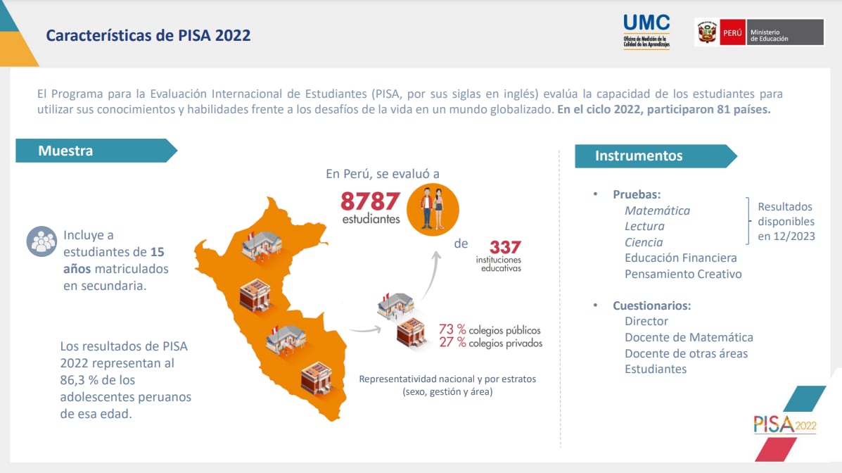 Esta edición contó con la participación de 8787 estudiantes peruanos de 15 años de edad provenientes de 337 instituciones educativas, de las cuales 73 % fueron públicas y 27 % privadas. Además de Lectura, Matemática y Ciencia, PISA 2022 evaluó la competencia de Educación Financiera e incluyó, por primera vez, la de Pensamiento Creativo. Los resultados en estas dos últimas competencias se difundirán el próximo año.