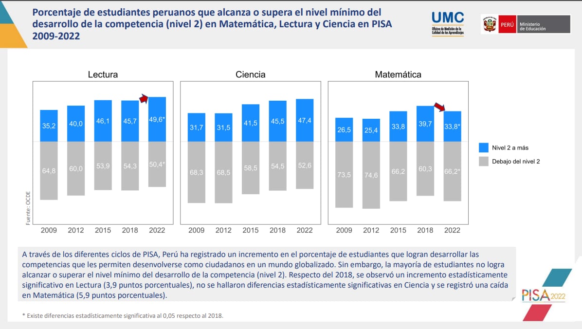 Según información del Minedu, el Perú subió siete puntos en Lectura (de 401 a 408) y cuatro puntos en Ciencia (de 404 a 408) respecto de PISA 2018, aunque estas diferencias no son estadísticamente significativas.