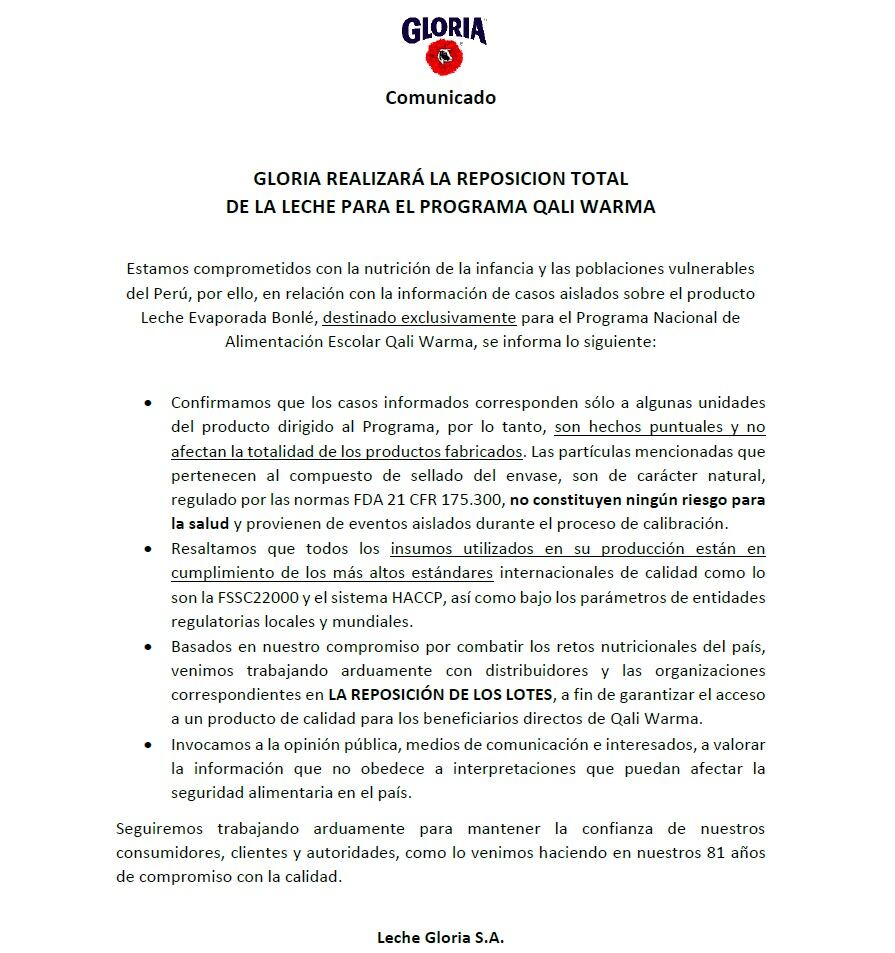 “Qali Warma paralizó la distribución y consumo de más de 746 toneladas de leche evaporada entera en la presentación de latas de 400 gramos de marca Bonlé del fabricante Gloria, debido al hallazgo de manchas y/o puntos negros identificados durante la supervisión en los almacenes de los proveedores”, se lee al inicio del mensaje.
