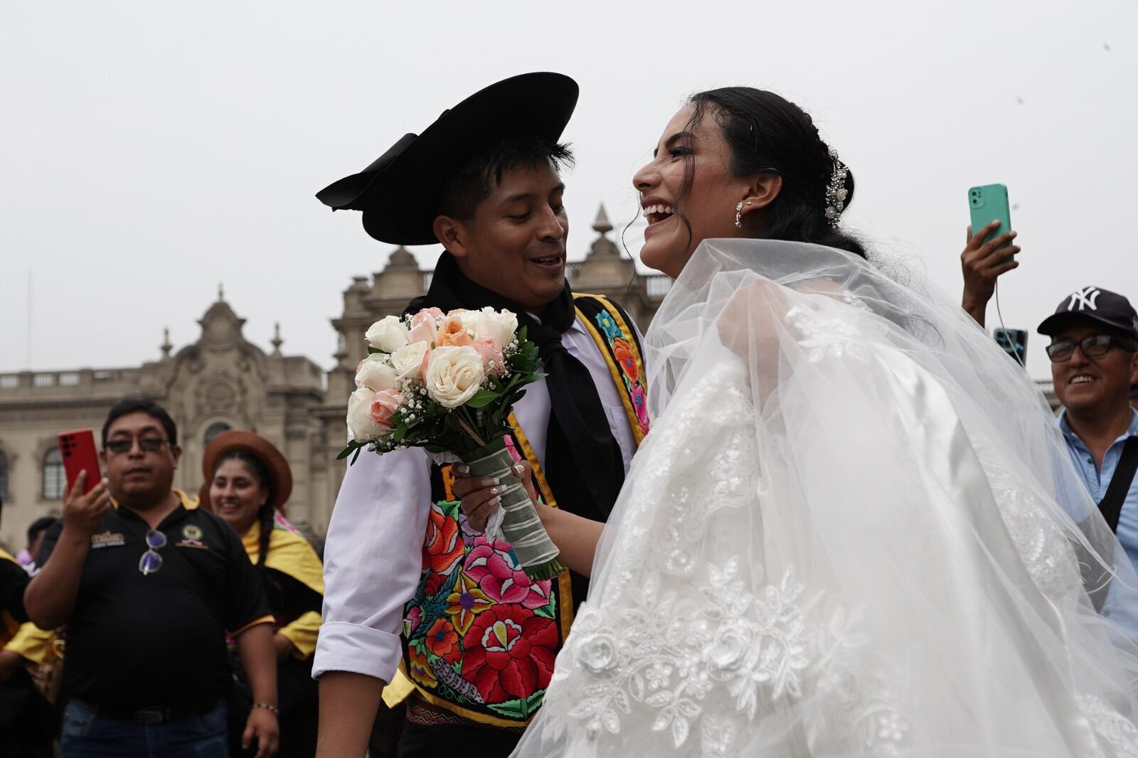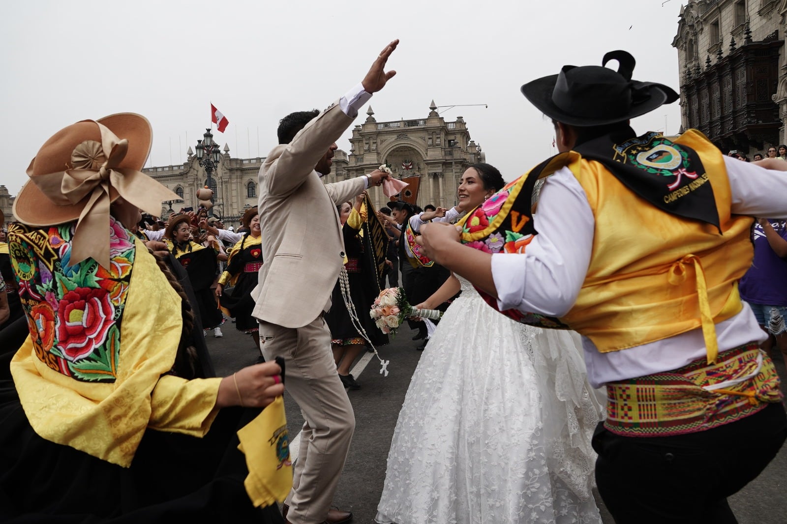 Uno de los momentos más emotivos de la jornada ocurrió cuando una pareja de recién casados, que salía de la Catedral de Lima, se vio sorprendida por el pasacalle. Llenos de entusiasmo, decidieron unirse a la celebración y zapatearon junto a los danzantes, convirtiendo su boda en un recuerdo único, repleto de cultura e identidad.