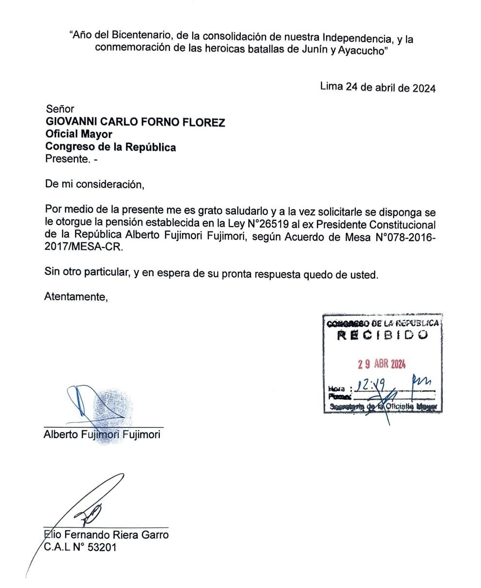 Alberto Fujimori, expresidente del Perú, envió un oficio a través de su abogado Elio Riera y solicitó al Congreso de la República que se le asigne una pensión amparados en la Ley 26519.