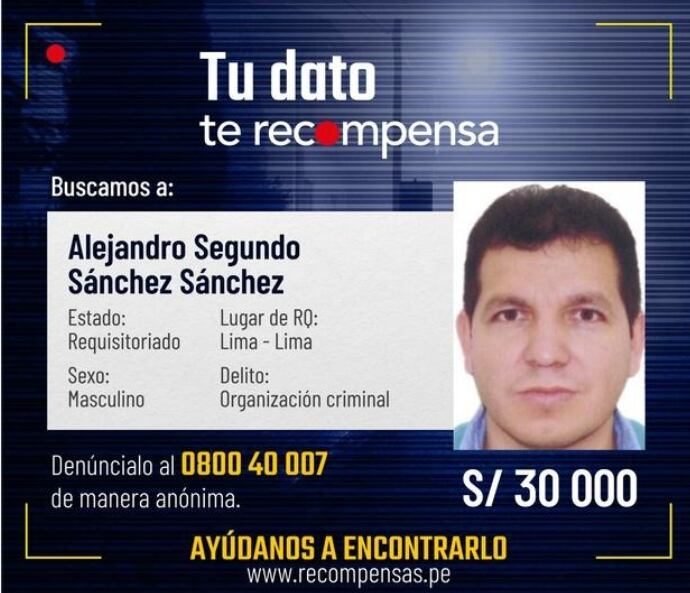 Recordemos que, en noviembre de 2022, Alejandro Sánchez fue incluido en la lista de los más buscados y se ofreció una recompensa de S/ 30 mil por cualquier información de su paradero. Además, cuenta con un pedido de prisión preventiva por 30 meses.