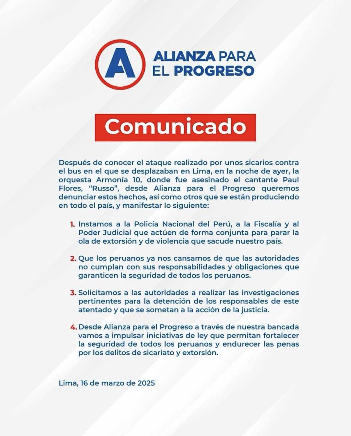 El partido Alianza para el Progreso (APP) emitió un comunicado este 16 de marzo, en el que condena el asesinato del cantante Paul Flores, vocalista de Armonía 10, y exige medidas contundentes contra la creciente ola de sicariato y extorsión en el país.