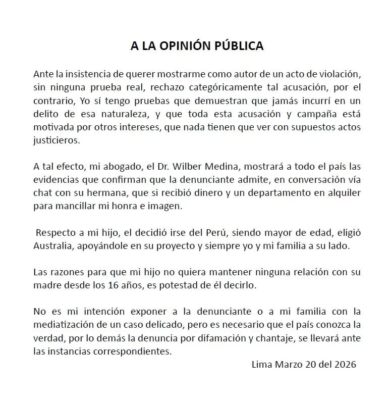 “Ante la insistencia de querer mostrarme como autor de un acto de violación, sin ninguna prueba real, rechazo categóricamente tal acusación. Por el contrario, yo sí tengo pruebas que demuestran que jamás incurrí en un delito de esa naturaleza y que toda esa acusación y campaña está motivada por otros intereses, que nada tiene que ver con supuestos actos justicieros”, indicó.