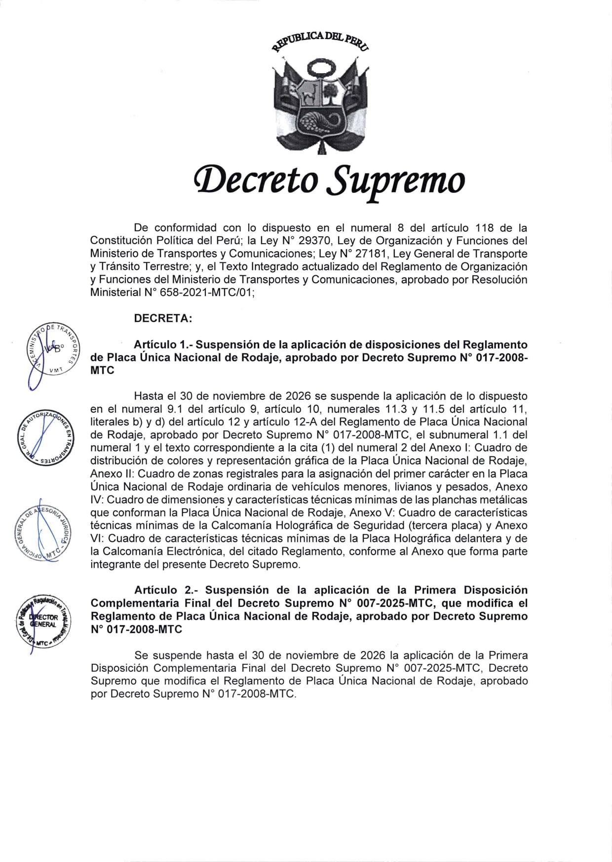 Como se recuerda, el MTC oficializó la postergación de las nuevas especificaciones técnicas para placas de motocicletas y vehículos de categoría L hasta el 30 de noviembre del 2026, mediante el Decreto Supremo N° 021-2025-MTC, con el objetivo de garantizar una “transición ordenada y eficiente” del sistema de identificación vehicular.