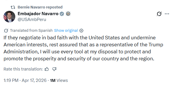 Mediante su cuenta de X, Navarro escribió lo siguiente el pasado viernes 17 de abril: “Si negocian de mala fe con EE.UU. y socavan los intereses estadounidenses, tengan la certeza de que como representante de la Administración Trump utilizaré todas las herramientas disponibles para proteger y promover la prosperidad y la seguridad de nuestro país y la región”.