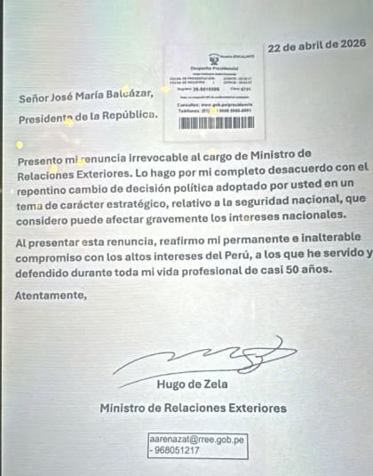 El ministro de Relaciones Exteriores, Hugo de Zela, presentó su renuncia irrevocable al cargo mediante una carta dirigida al presidente de la República, José María Balcázar, con fecha 22 de abril de 2026.