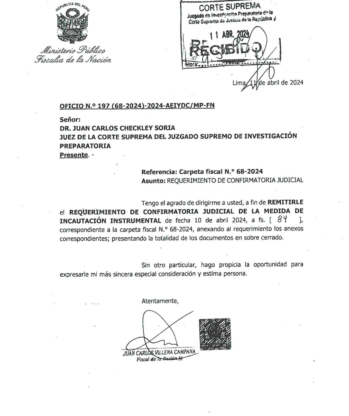 El requerimiento de ratificación de incautación de los bienes, solicitado por la Fiscalía de la Nación, fue notificado a la defensa de la presidenta Dina Boluarte, al abogado de Wilfredo Oscorima y a las partes involucradas en el caso. Se les concedió un plazo de tres días hábiles para responder al Requerimiento Fiscal de Confirmatoria de Incautación. Una vez transcurrido este plazo, se procederá a convocar a una audiencia.