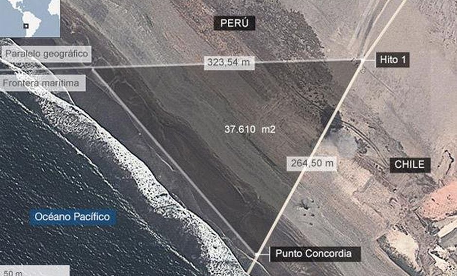 Chile sostiene que el límite se inicia en el llamado Hito No.1, mientras que para Perú arranca en el llamado Punto Concordia, casi 270 metros más hacia el Pacífico.