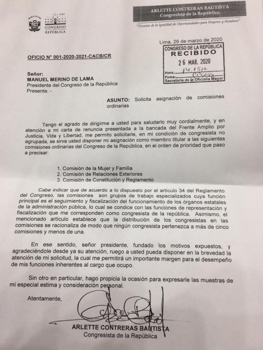 La legisladora remitió una carta al presidente del Congreso, Manuel Merino, solicitando la asignación de comisiones ordinarias, en la cual da cuenta de su renuncia a dicha bancada.