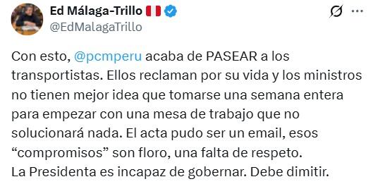 “Con esto, la presidencia del Consejo de Ministros acaba de PASEAR a los transportistas. Ellos reclaman por su vida y los ministros no tienen mejor idea que tomarse una semana entera para empezar con una mesa de trabajo que no solucionará nada”, sostuvo.