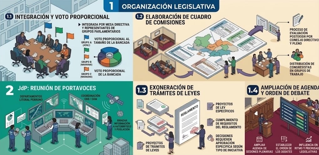 Por su parte, la Junta de Portavoces tiene la facultad de modificar y complementar la agenda previamente establecida. Además, puede definir el orden de prioridad de los temas que serán discutidos durante las sesiones.