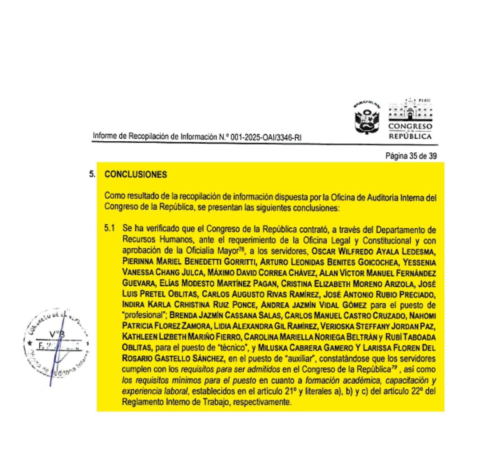 “Se ha verificado que el Congreso de la República contrató, a través del Departamento de Recursos Humanos, ante el requerimiento de la Oficina Legal y Constitucional y con aprobación de la Oficialía Mayor”, precisa la conclusión del documento.