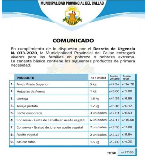 Según la guía de orientación “Gestión y Distribución de Canastas Familiares en el marco de la emergencia nacional por el brote del COVID-19)” establecido por el Estado se asignó a las municipalidades del país la cantidad de 1 a 2 millones de soles. La comuna del primer puerto recibió S/. 1 millón para entregar canastas con víveres conteniendo productos de 80 soles por familia.