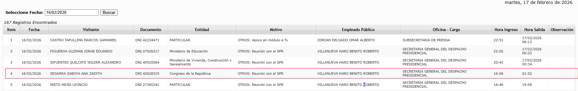 A las críticas se suma una reunión previa entre la congresista Ana Zegarra y el presidente del Congreso, José Jerí, realizada un día antes de la votación de las mociones de censura. De acuerdo con el registro de visitas del portal de Transparencia, Zegarra acudió a Palacio de Gobierno el lunes 16 de febrero y permaneció en el lugar por más de cuatro horas.