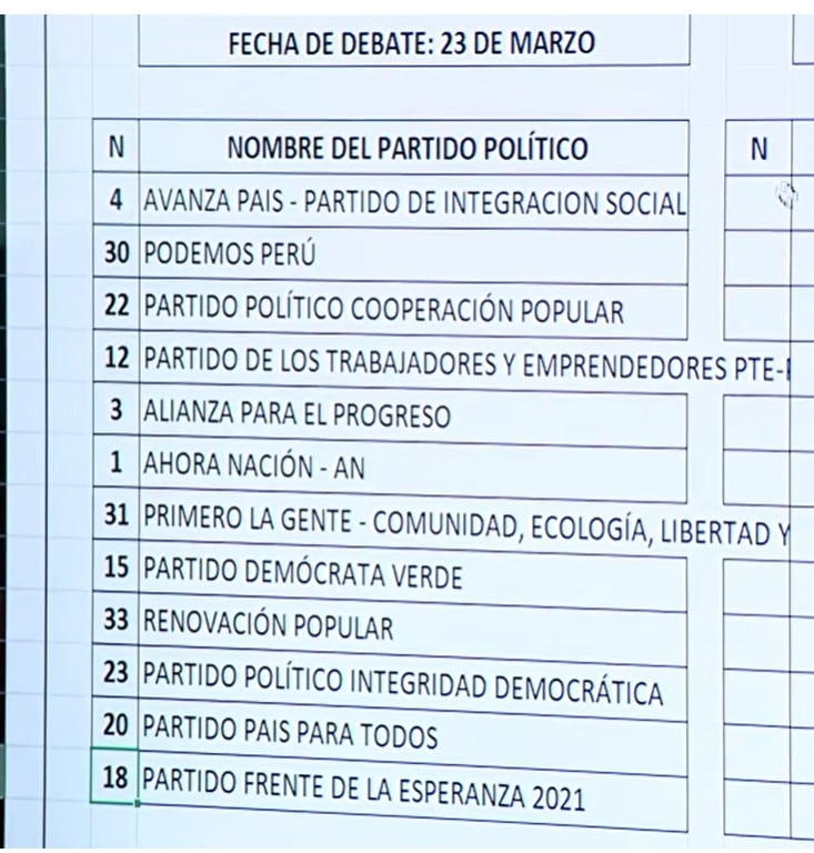 El JNE reveló el tercer grupo programado para debatir el próximo 25 de marzo. La contienda reunirá al partido conservador Fuerza Popular y a otros de diferentes líneas como Salvemos al Perú, Partido del Buen Gobierno, Partido Polítoco Perú Primero, Partido Aprista Peruano, Libertad Popular, Progresemos, Partido Morado, Unidad Nacional, Alianza Electoral Venceremos, Partido Patriótico del Perú y Un Camino Diferente.