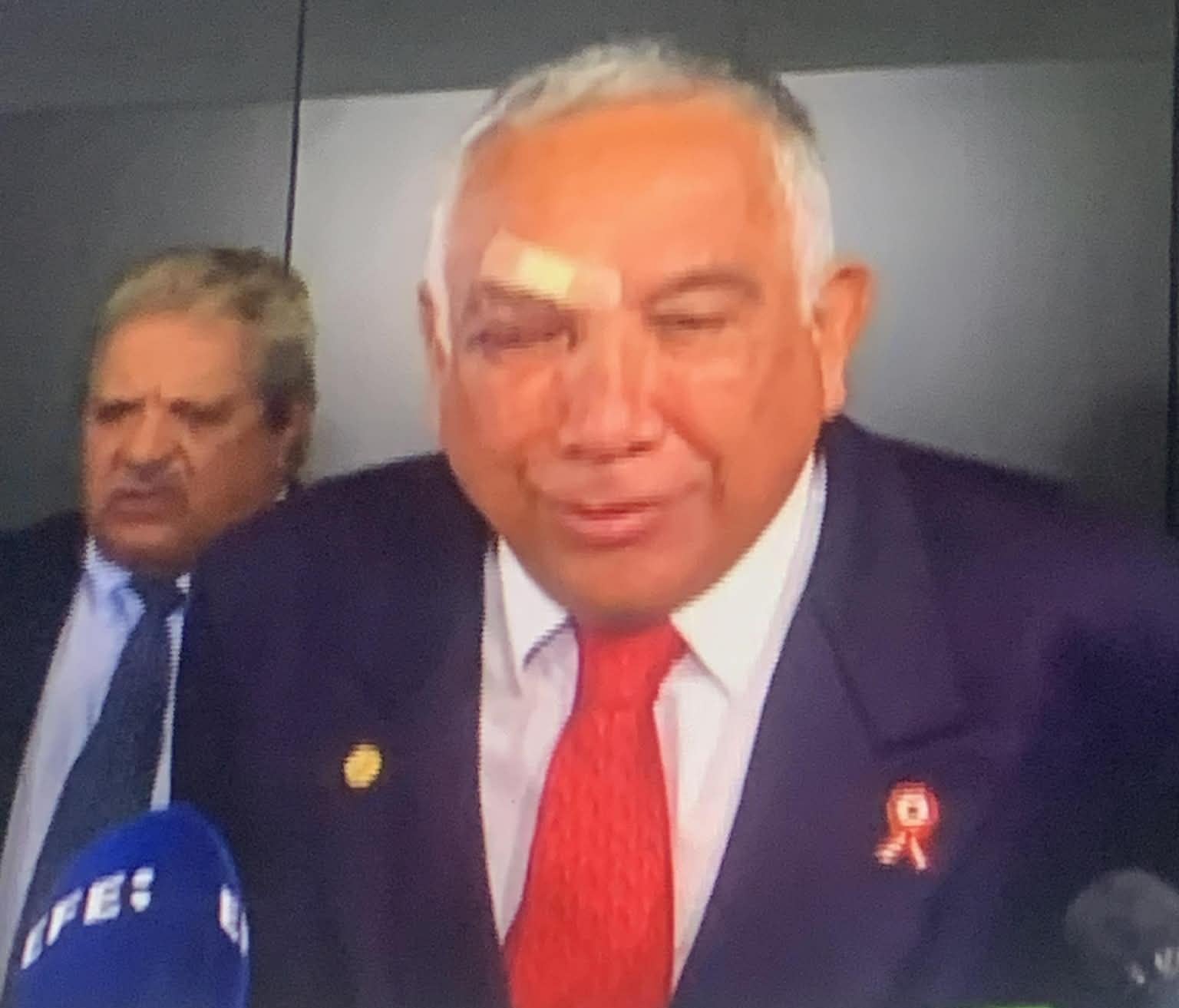 Armando Massé se presenta en el Centro de Convenciones de San Borja y ofrece declaraciones a la prensa. El postulante evidencia un golpe en el ojo derecho, además de puntos y una curita sobre la ceja.