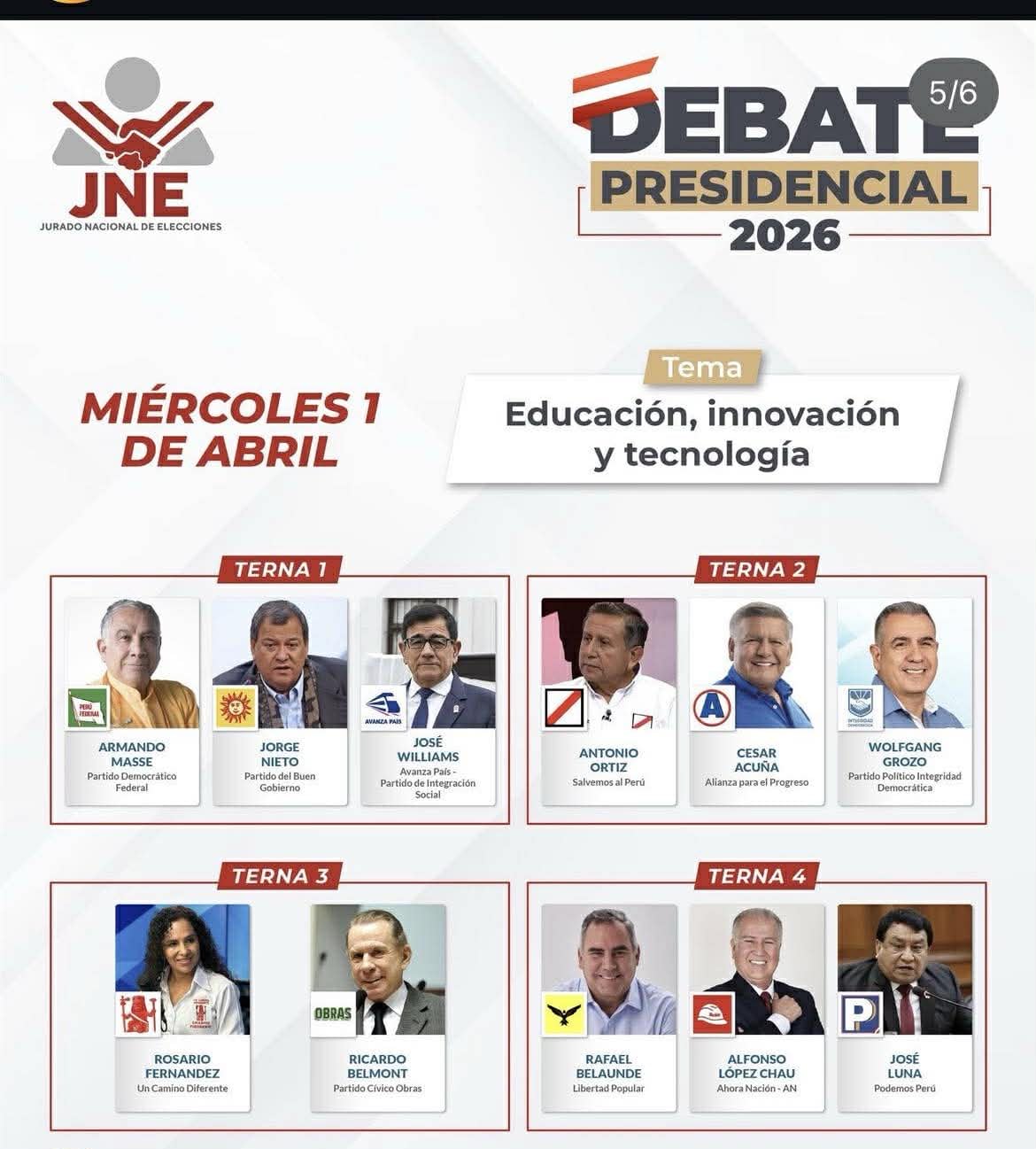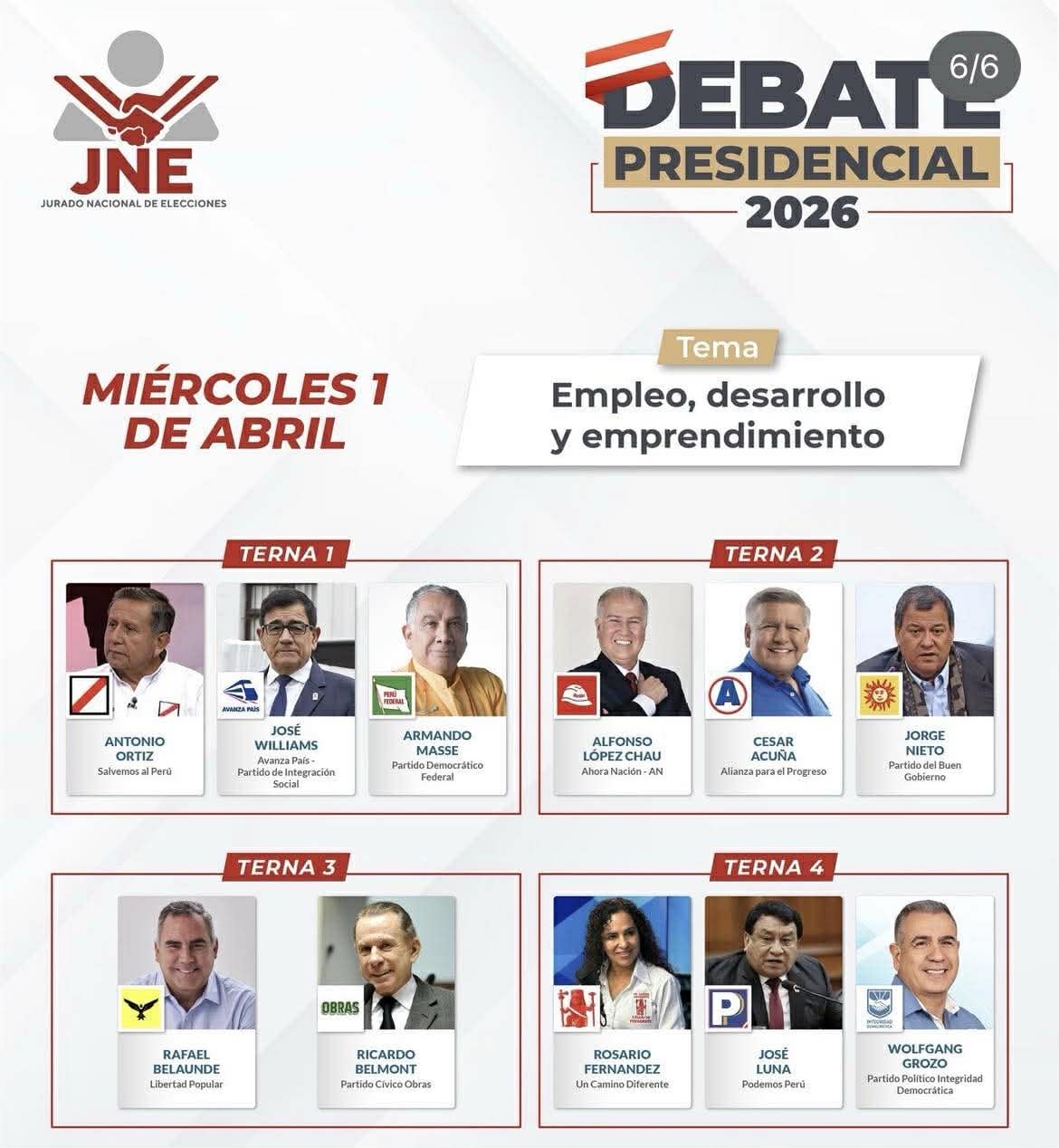 Este 1 de abril se llevará a cabo la sexta y última jornada del debate presidencial con miras a las Elecciones Generales 2026, en una actividad organizada por el Jurado Nacional de Elecciones (JNE). En esta fecha final participará un nuevo grupo de candidatos, quienes expondrán sus propuestas ante la ciudadanía en el cierre de esta etapa.