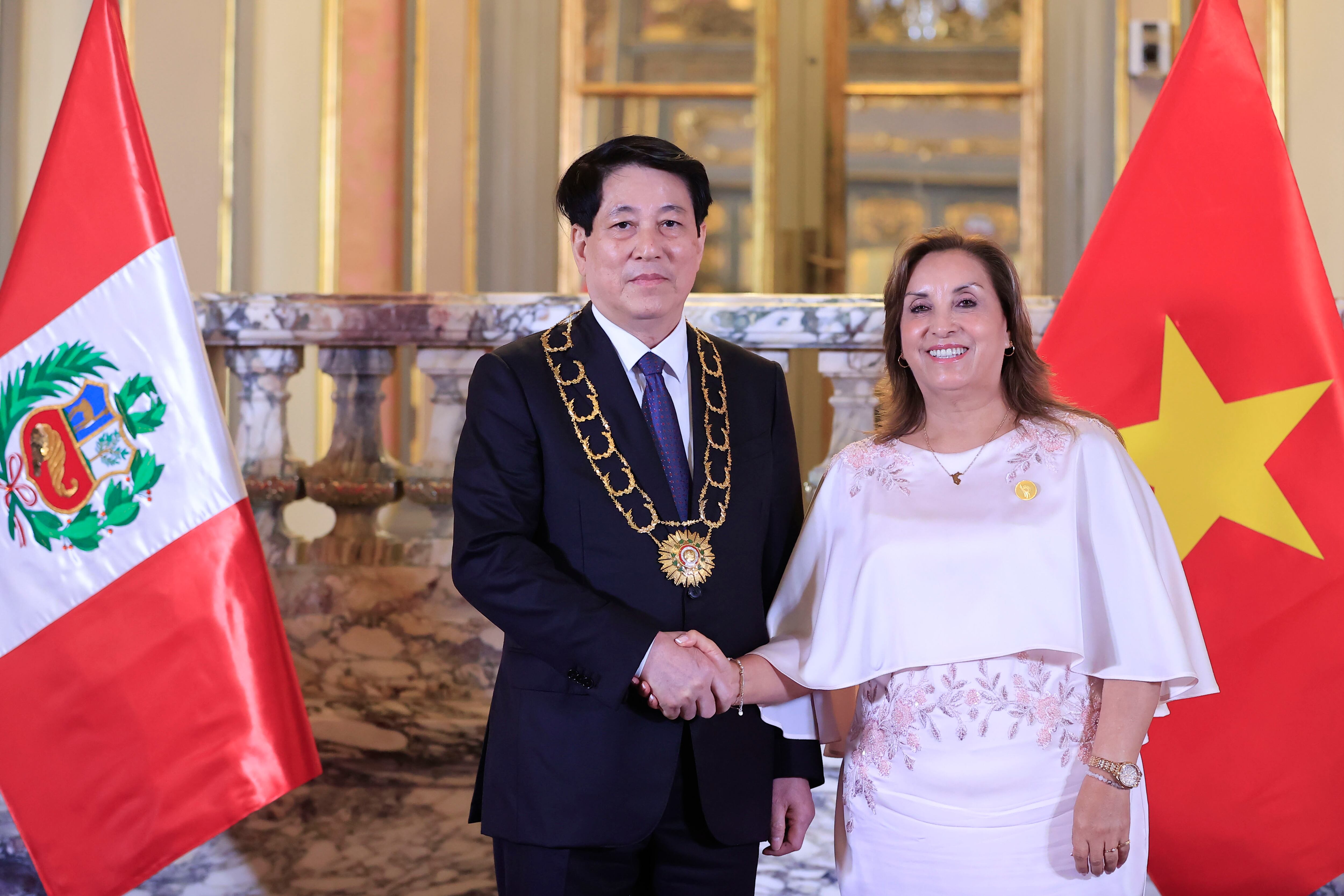 La presidenta Dina Boluarte entregó el Gran Collar de la Orden ‘El Sol del Perú’ al presidente de Vietnam, Luong Cuong, en una ceremonia celebrada en Palacio de Gobierno.