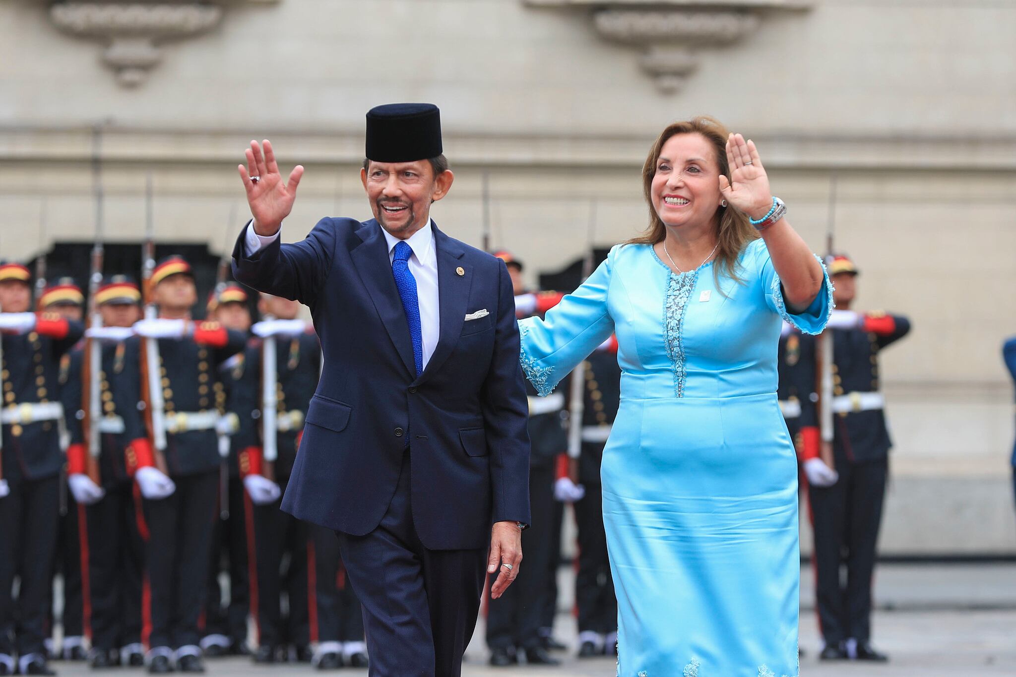 La Presidenta de la República, Dina Ercilia Boluarte Zegarra, recibe actualmente en Palacio de Gobierno al Sultán de Brunéi Darusalam, Su Majestad Haji Hassanal Bolkiah, quien realiza una visita oficial al Perú para fortalecer los lazos entre ambos países.