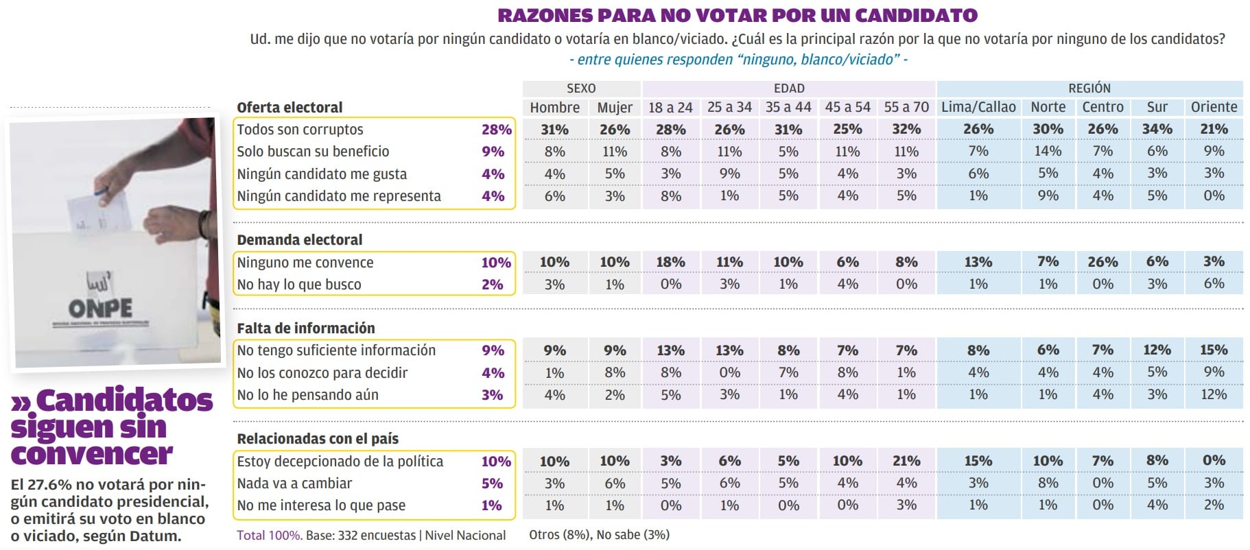 Cierra el sector de regiones, el centro. Allí, de 811 mil electores, 474 mil 607 (26%) consideraron a todos “corruptos”, 169 502 (26%) no se sienten “convencidos” por las actuales propuestas y 45 mil 635 (7%) expresaron su decepción por la política.