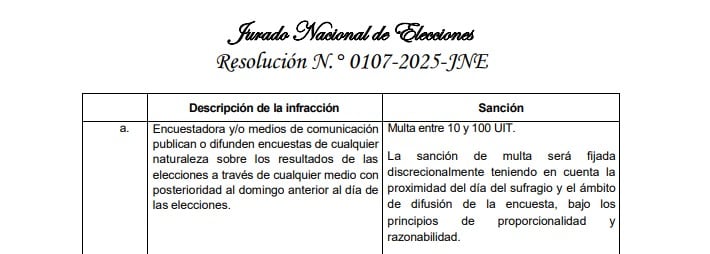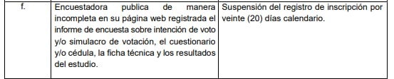 Además de las multas, el organismo electoral contempla medidas administrativas adicionales contra las encuestadoras que incumplan la normativa. En caso de que una empresa publique encuestas sin consignar información obligatoria como la ficha técnica, el cuestionario, el informe del estudio o los resultados completos podrá ser suspendida por 20 días calendario.