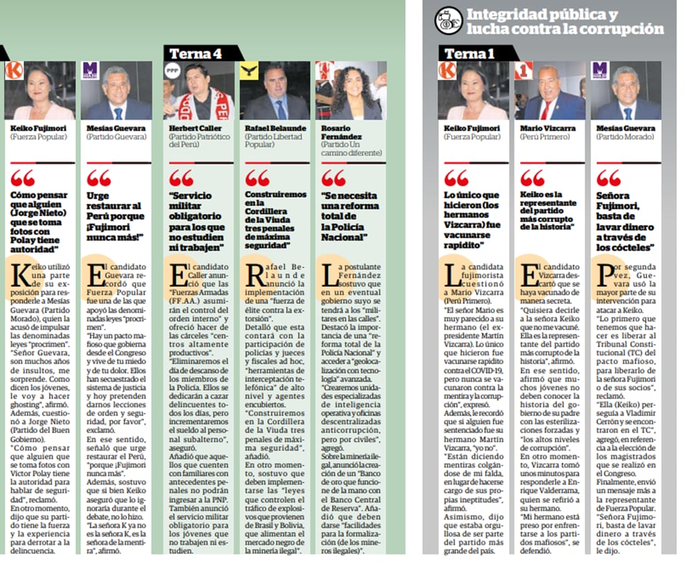 Keiko Fujimori, de Fuerza Popular, consideró que los debates son importantes para tomar la mejor decisión. “Un debate es una posibilidad de lanzar propuestas. Le deseo la mejor de la suerte a los candidatos. De mi parte solo van a escuchar propuestas, de los demás, no sé”, afirmó.