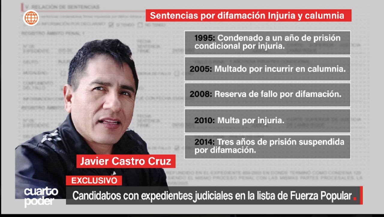 El programa “Cuarto Poder”, reveló que entre los postulantes del del partido que lidera Keiko Fujimori, figuran al menos 28 personas condenadas por distintos delitos y otros que actualmente enfrentan procesos en curso mientras participan en la campaña electoral.