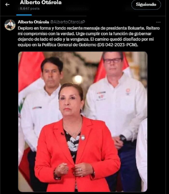 “Deploro en forma y fondo reciente mensaje de presidenta Boluarte. Reitero mi compromiso con la verdad. Urge cumplir con la función de gobernar dejando de lado el odio y la venganza. El camino quedó diseñado por mi equipo en la Política General de Gobierno (DS 042-2023-PCM)”, escribió el exprimer ministro del actual gobierno.