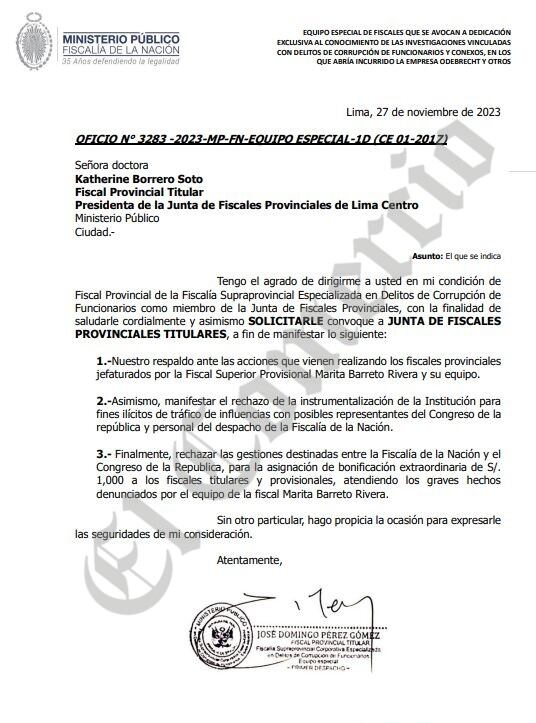 En el documento, Pérez Gómez expresa la importancia de brindar un “respaldo ante las acciones que vienen realizando los fiscales provinciales jefaturados por la fiscal superior provisional, Marita Barreto Rivera, y su equipo”.