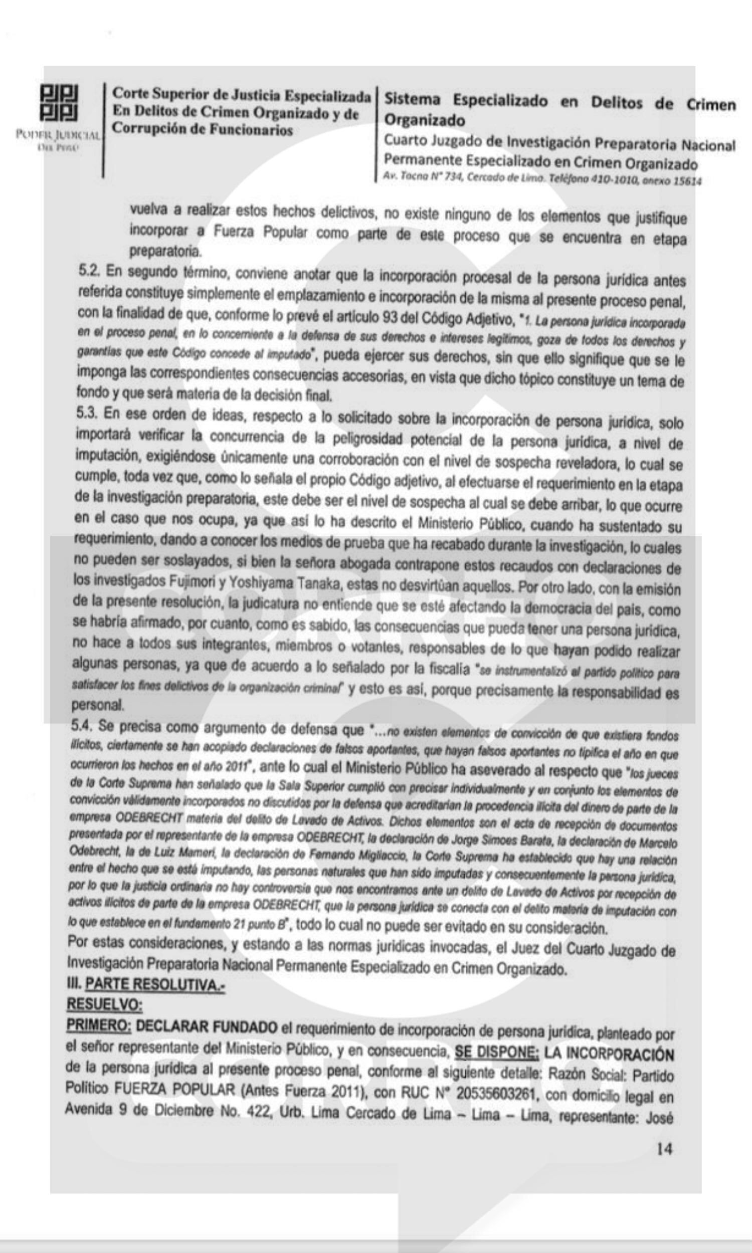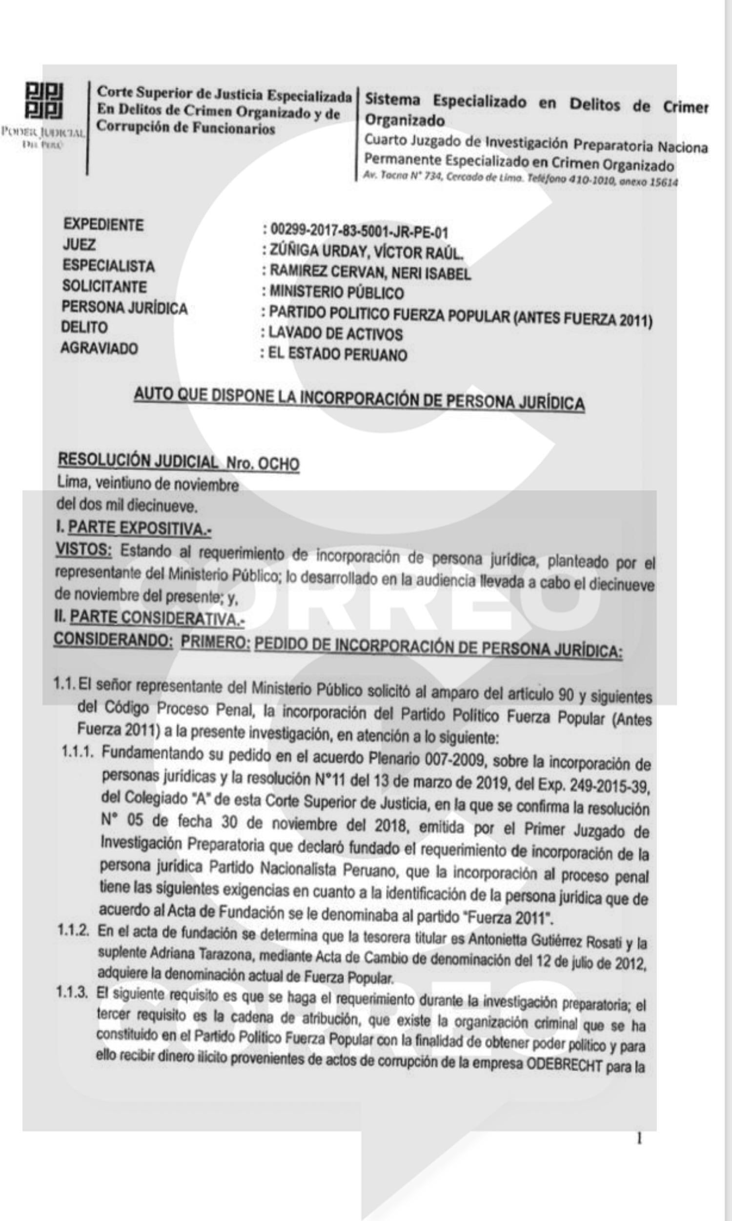 “Declarar fundado el requerimiento de incorporación de persona jurídica, planteado por el señor representante del Ministerio Público y en consecuencia de dispone la incorporación de las persona jurídica al presente proceso penal”, se lee en el documento al que tuvo acceso Correo.