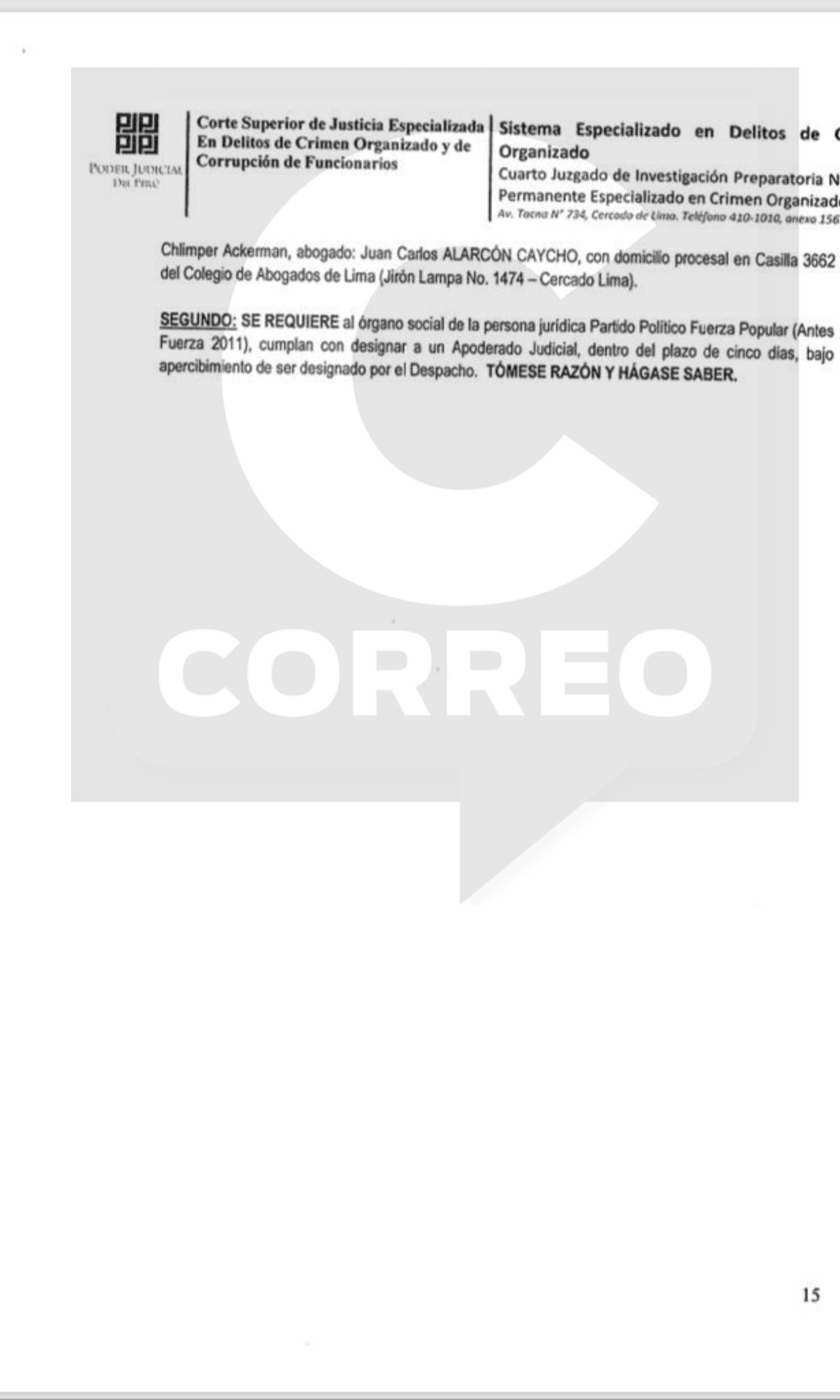 El juez Víctor Zúñiga Urday también requirió al órgano social de Fuerza Popular a que designe a un "apoderado judicial, dentro del plazo de cinco días, bajo apercibimiento de ser designado por el despacho”.