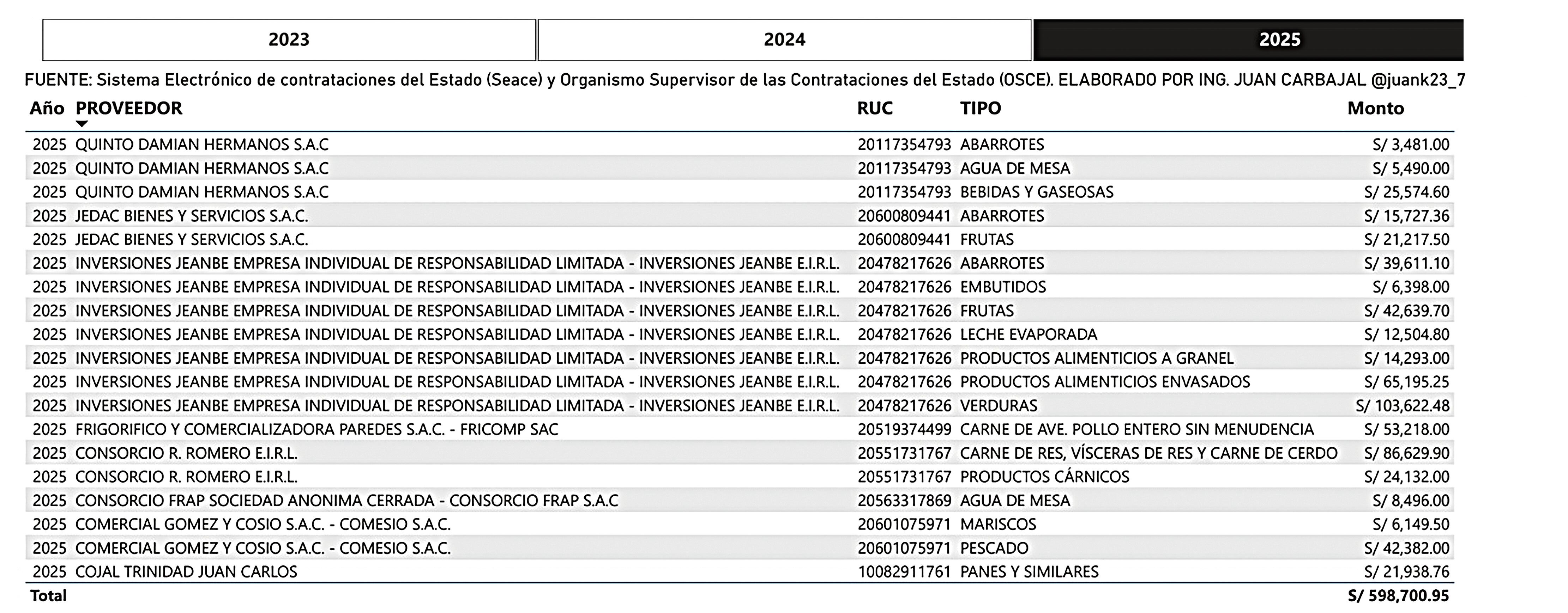 Así, solo en los primeros 120 días del año, el gasto en productos como abarrotes, carnes, frutas, embutidos, gaseosas y otras bebidas llegó a 598,700 soles, lo que representa un incremento de más del 10 % en comparación con el mismo periodo de 2024, cuando se destinaron 540,000. En 2023, el desembolso fue de 550,000 soles.