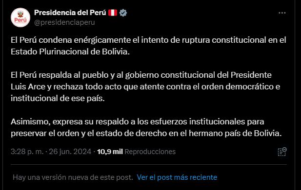 “El Perú condena enérgicamente el intento de ruptura constitucional en el Estado Plurinacional de Bolivia. El Perú respalda al pueblo y al gobierno constitucional del Presidente Luis Arce y rechaza todo acto que atente contra el orden democrático e institucional de ese país”, manifestaron este miércoles en redes sociales.
