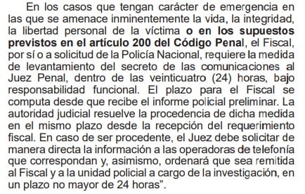 En caso de declarar procedente el pedido, la autoridad judicial solicitará directamente a las operadoras telefónicas correspondientes la entrega de la información requerida y ordenará que sea enviada al fiscal y a la unidad policial a cargo de la investigación, también en un plazo no superior a 24 horas.