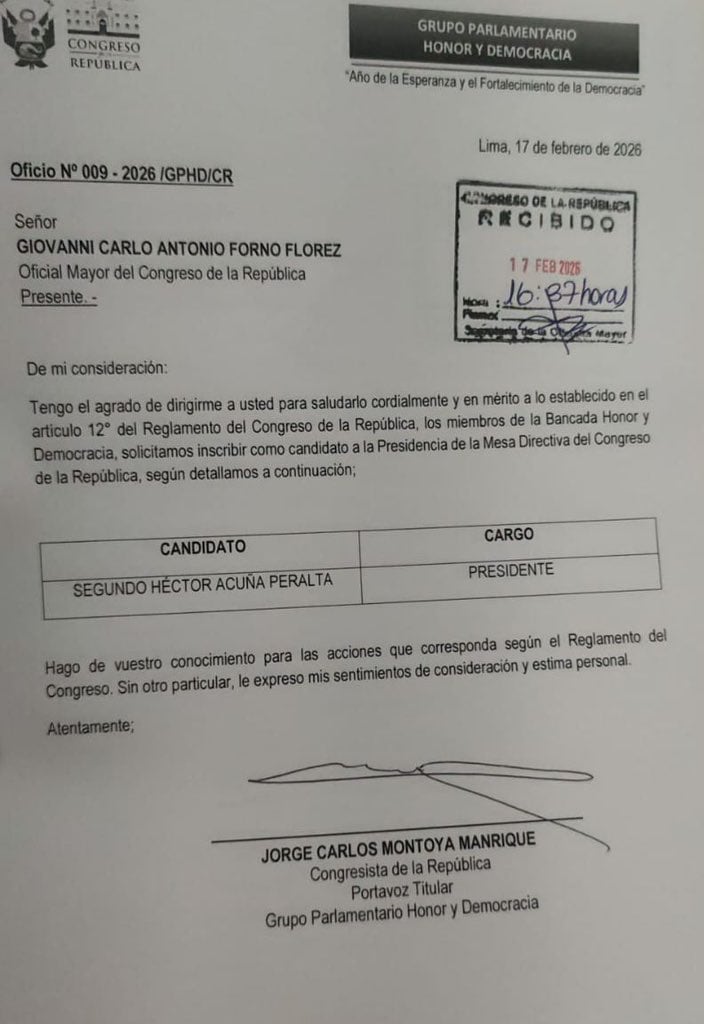 El congresista Héctor Acuña Peralta, integrante de la bancada Honor y Democracia, formalizó su candidatura a la Presidencia de la Mesa Directiva del Congreso, cargo que también implica asumir la Presidencia de la República por sucesión constitucional.