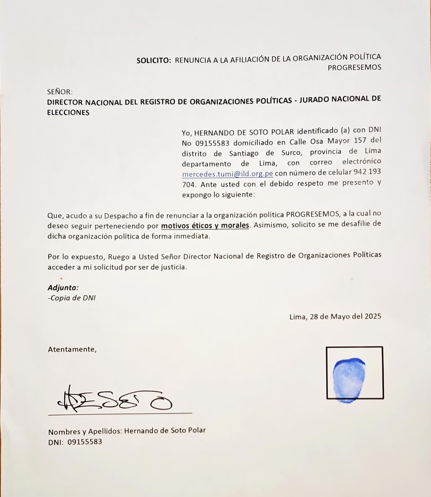 En el documento oficial presentado al Registro de Organizaciones Políticas, De Soto solicitó la desafiliación inmediata de Progresemos, alegando que no desea seguir vinculado a una agrupación que ha vulnerado los compromisos asumidos y ha incorporado, según dijo, a personas con antecedentes judiciales cuestionables.