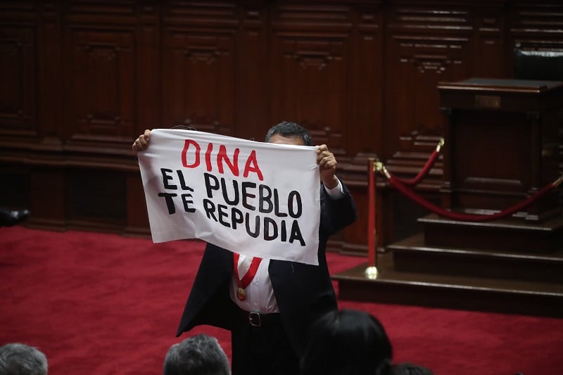 Los legisladores rechazaron el discurso de Dina Boluarte y algunos mostraron mensajes contra el actual gobierno: “¡Dina el Pueblo te repudia!, se lee en uno de los carteles contra la jefa de Estado”.
