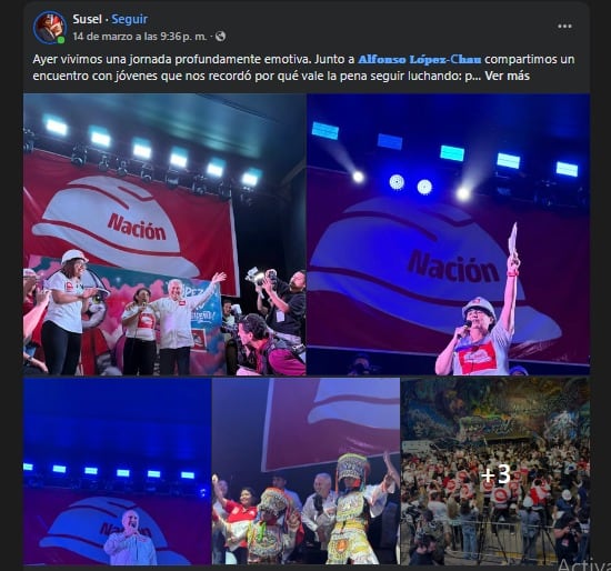 Algunas publicaciones muestran a la congresista junto al candidato presidencial Alfonso López Chau en actividades de campaña. Otros materiales destacan el símbolo partidario de la agrupación y contienen llamados directos a respaldar esa opción política en las elecciones.