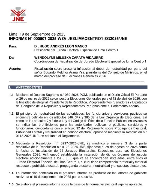 El área de Fiscalización del Jurado Electoral Especial (JEE) de Lima Centro emitió un informe en el que concluye que el presidente del Consejo de Ministros, Eduardo Arana, habría vulnerado el principio de neutralidad en periodo electoral tras un pronunciamiento difundido por la Presidencia del Consejo de Ministros (PCM).