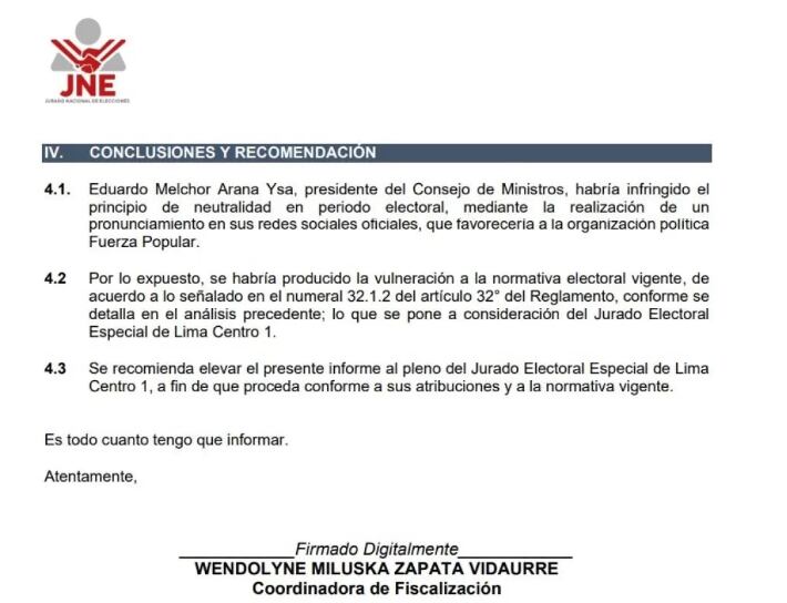 “Eduardo Melchor Arana Ysa, presidente del Consejo de Ministros, habría infringido el principio de neutralidad en periodo electoral, mediante la realización de un pronunciamiento en sus redes sociales oficiales, que favorecería a la organización política Fuerza Popular”, indica el documento.