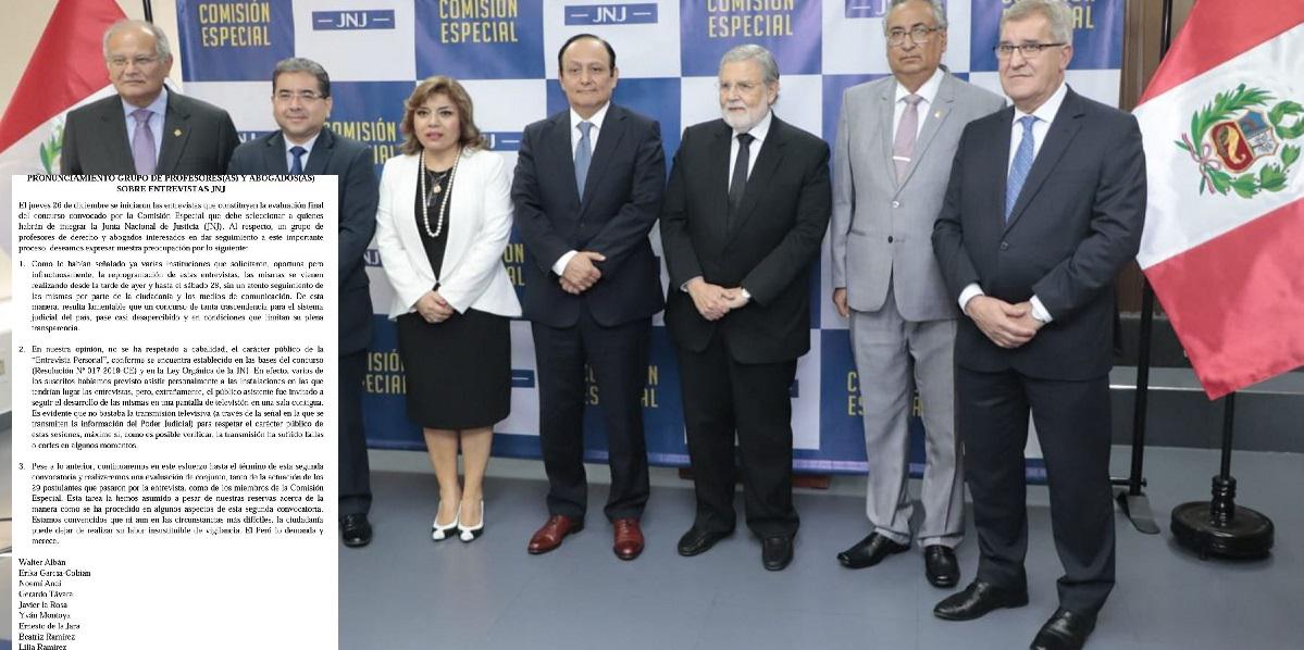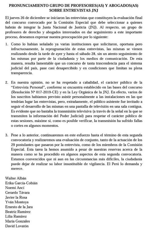 A través de un un comunicado los especialistas Walter Albán, Yván Montoya, Javier La Rosa, Beatriz Ramírez, Noemí Ancí, Ernesto de la Jara, Lilia Ramírez, María Gonzales y David Lovatón refieren que no se respetó el carácter público del proceso, pues la sociedad civil no pudo estar presente en la ronda de entrevistas; y que solo se pudo ver en una transmisión con cortes.