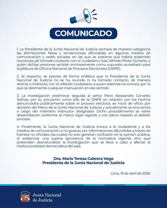 Mediante un comunicado oficial firmado por la presidenta de la JNJ, María Teresa Cabrera Vega, la institución negó cualquier relación con el ciudadano José Alfredo Pérez Duhrarte, quien fue mencionado en algunas versiones como supuesto aspirante al cargo.