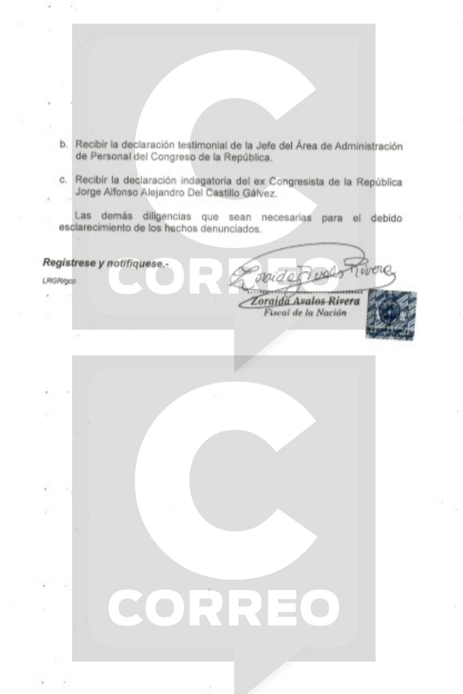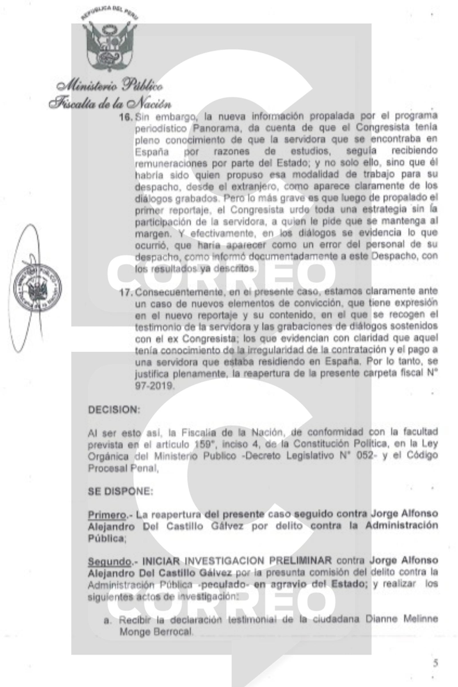 “Iniciar investigación preliminar contra Jorge Alfonso Alejandro del Castillo Gálvez por la presunta comisión del delito contra la administración pública -peculado- en agravio del Estado”, se agrega.