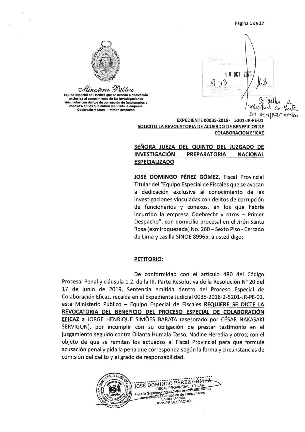 “Este Ministerio Público-Equipo Especial de Fiscales requiere se dicte la revocatoria del beneficio del proceso especial de colaboración eficaz a Jorge Henrique Simoes Barata”, se lee en el documento al que Correo tuvo acceso.