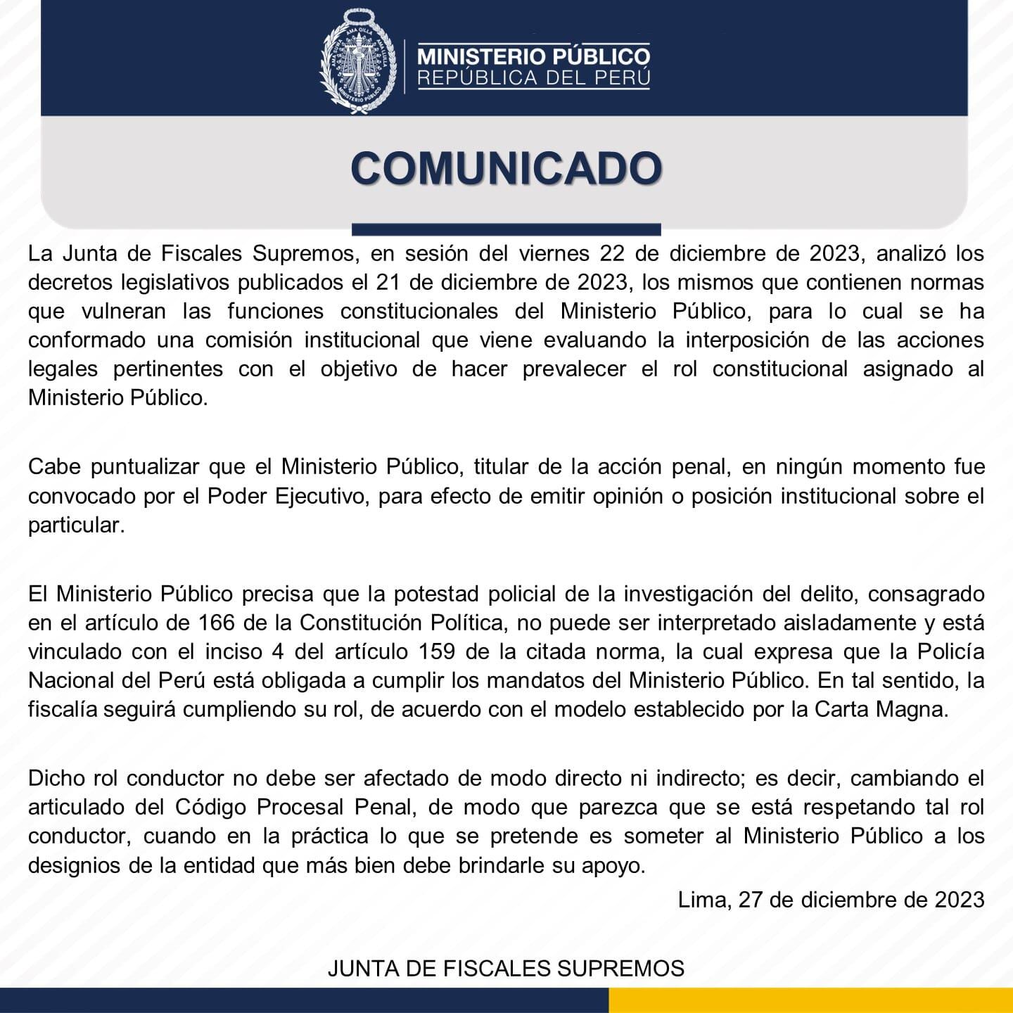 A través de un comunicado publicado en redes sociales, la Junta de Fiscales supremos reveló que evaluaron los decretos legislativo publicado el 21 de diciembre y señaló que estos “contienen normas que vulneran las funciones constitucionales del Ministerio Público”, ante ello, la Fiscalía tomaría “acciones legales pertinentes con el objetivo de hacer prevalecer el rol constitucional asignado al Ministerio Público”.