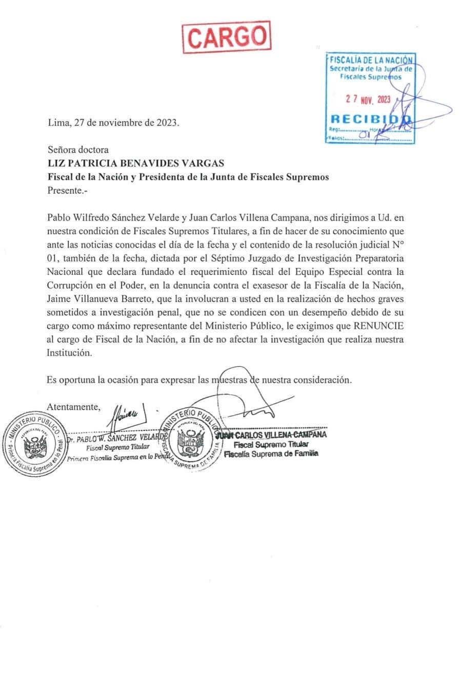 Pablo Sánchez y Juan Carlos Villena, Fiscales Supremos Titulares, solicitaron la renuncia inmediata al cargo a la fiscal de la Nación, Patricia Benavides, tras la detención preliminar de su exasesor en el Ministerio Público y tras conocerse que lideraría una presunta organización criminal.