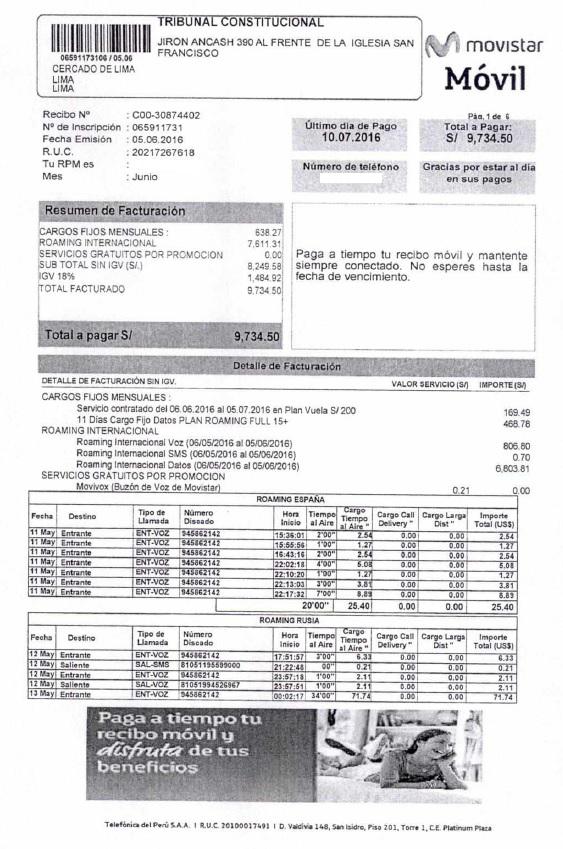 Cuando el magistrado Eloy Espinosa-Saldaña Barrera del Tribunal Constitucional (TC) viajó a Rusia y España en junio del 2016, gastó casi 10 mil soles en roaming internacional, entre otros cargos.