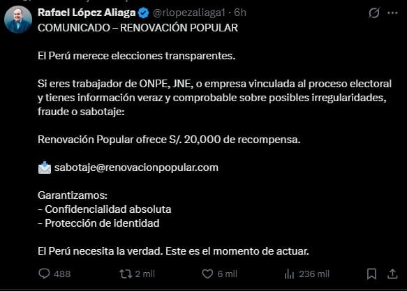 El candidato presidencial Rafael Bernardo López Aliaga Cazorla, líder del partido Renovación Popular, anunció el ofrecimiento de una recompensa de S/ 20,000 para quienes proporcionen información verificable sobre presuntas irregularidades en el proceso electoral.