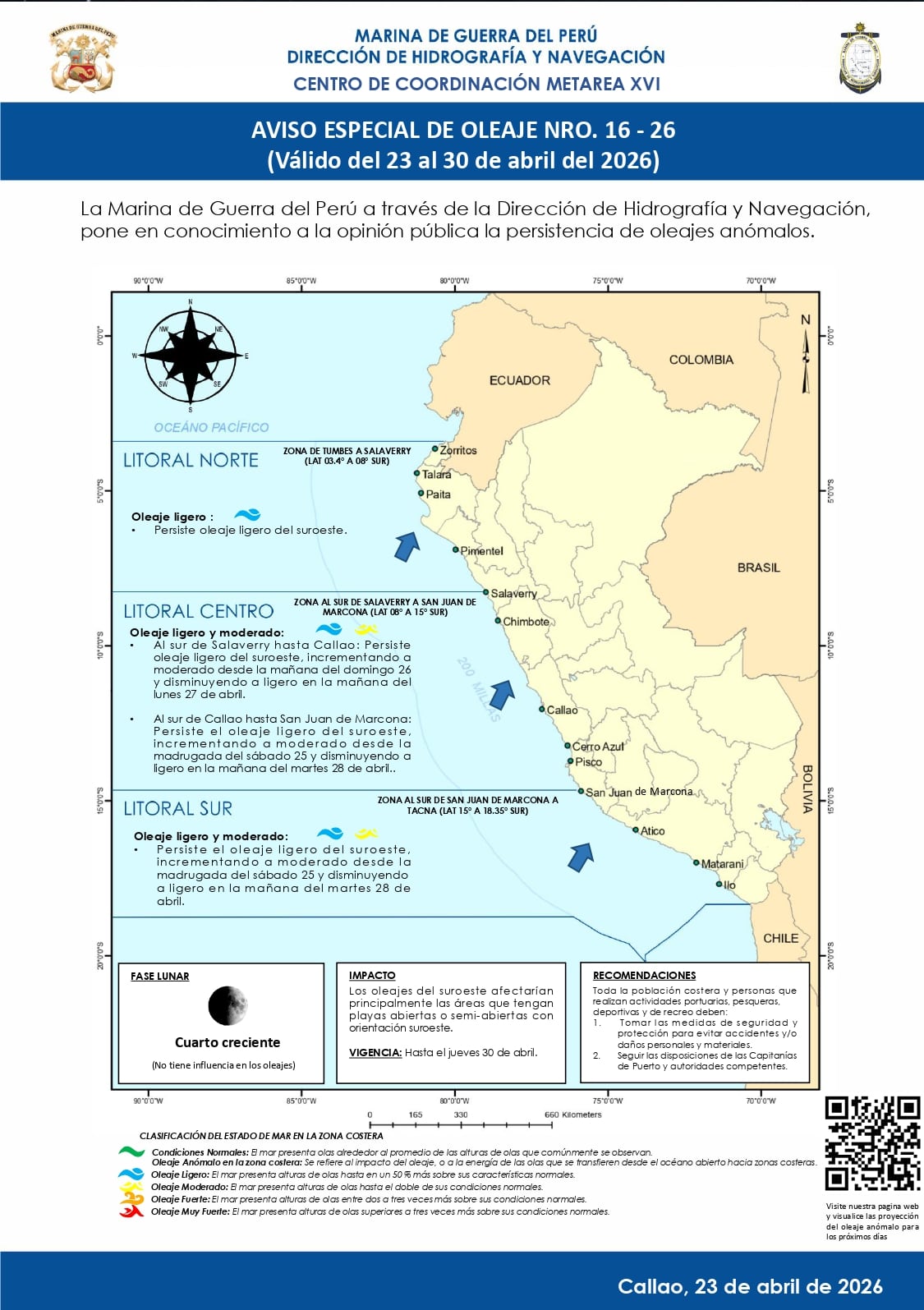 La Marina de Guerra del Perú informó que en los próximos días se registrarán cambios en el comportamiento del mar a lo largo del litoral. A través de la Dirección de Hidrografía y Navegación, se comunicó que continuarán presentándose oleajes con niveles que podrían alcanzar intensidad moderada hacia el cierre del mes de abril.